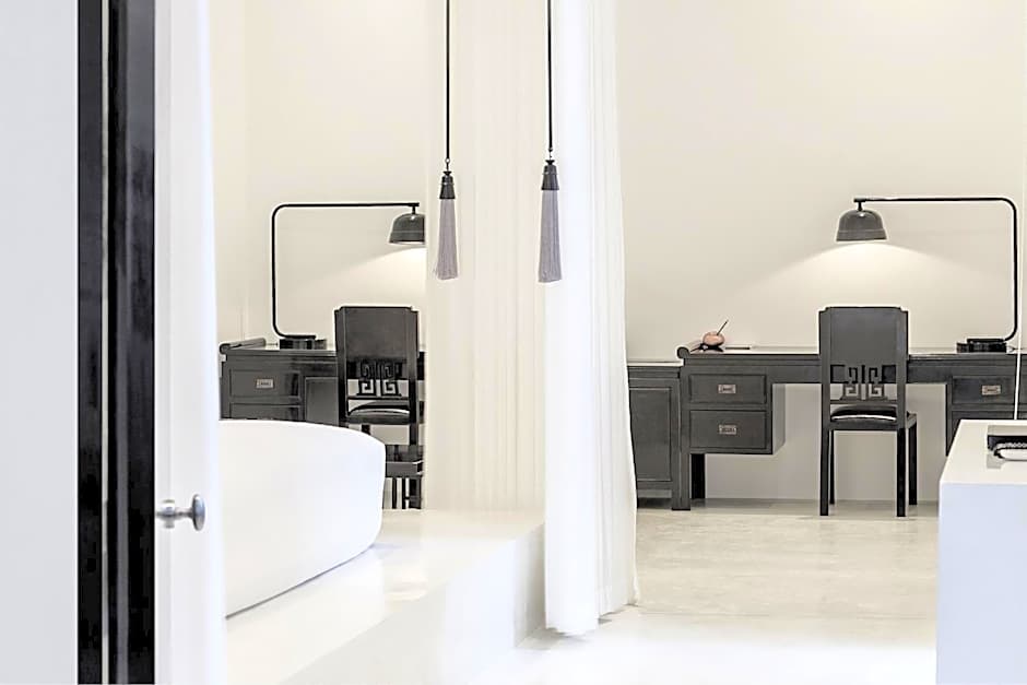 Featuring a 10-yard saltwater swimming pool, this pool villa offers 2 master bedrooms, a working area as well as living and entertainment areas. Guests can also work out at a private gym equipped with fitness facilities. For added convenience, there are 55-inch smart TVs with Blu-ray players, sound bar, mood lighting and outdoor speakers. An private bathroom includes a spa tub, a rain shower as well as male and female sinks. There are also a safety box, a coffee maker, a wine fridge and a mini-bar.